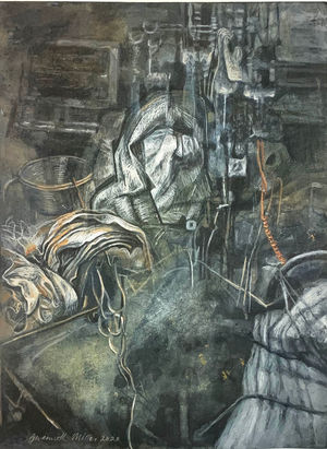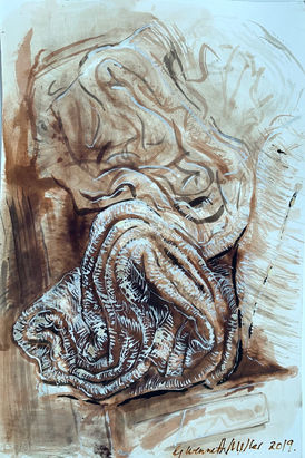 Pointing to the complexities of our lived experience, the exhibition title of “Enfolding” also finds an echo in Gilles Deleuze' (1993) writing on The fold: Leibniz and the Baroque. As such the abstraction within works becomes an attempt to grapple with enfolding meaning and searches for a measure of insight into the journey we travel in our bodies. Deleuze (1993: 86) describes the human being as "monad" (an indivisible entity), who is a full expression of the "world, but obscurely and dimly because it is finite and the world is infinite...It is as if the depths of every monad were made from an infinity of tiny folds (inflections) endlessly furling unfurling in every direction, so that the monad's spontaneity resembles that of agitated sleepers who twist and turn on their mattresses." Apart from the literal reference to folds and its implied complexity that relates to the theme of this exhibition, the works find resonance in the tone of dissonance as expressed in the fragmentation and sombre greys. Works such as Sorrow, Reading Harari: 21 lessons, and At the foot of the bed relate closely to deep-felt movement of shifting , seen in the organic shapes of the compositions and tension of layered spaces. The thread of all sorrows is compiled of cropped details from Renaissance paintings which portray lamentation, recognising the experience of bereavement as an expression through history.