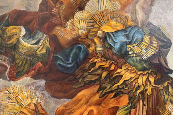 Loss and its Remains included five artworks.  Influenced by personal loss and Kristeva’s [1] writing on despair and sorrow, I evoke the relationship of loss and its tangible fragments. The exhibition included diverse media: oil paintings, collage, mixed media drawing and photographic work, unified under a sub-theme of the fold. The use of layers, relative to specific sites, was a deliberate conceptual and structural device to consider different angles ones can approach the idea of folds. Aligned with the broader theme of affect and complexity, I drew on Deleuze’s  [2] writings on the fold and how thought is enfolded within itself.